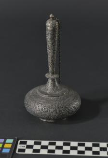 Descriptionbottle has a rounded body resting on a short foot and a tall narrow flared neck with small domed fitted lid; surface overall has been worked in a small intricate raised decorative pattern;