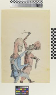 Untitled (two figures fighting, one blue, one red)