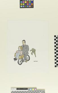 Descriptiondrawing of a man on a bicycle with a woman sitting in the front basket, a bear in the background is gives chase.Status
