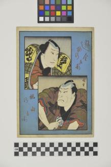 DescriptionTwo kabuki actors. Actor on top inset, mimasu Daigoro is in the role of Neji Ume no Kinbei. he is wearing a kimono with large "shogi" pieces pattern. The lower inset shows kataoka Ichizo playing Une no Yuhei. He is in a kimono with golden cranes and black birds.