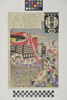 Description"Oh Edo nenju Gyoji Shibai" (Annual Events of the Theatrical Year in Great Edo). A set of 25 designs, 23 by Ginko and 2 by Torii Kiyosada. "Norikomi" (Arriving). The excited Onoe kikugoro fan club members, Hiiki renchu", are cheerfully welcoming their idol as he arrives by palanquin in the theatre district. The actor's crest, "mon", is emblazoned on folding fans people are waving.Status