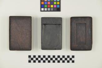 DescriptionRectangular, soft black ink stone, with wooden box (base and lid).Status