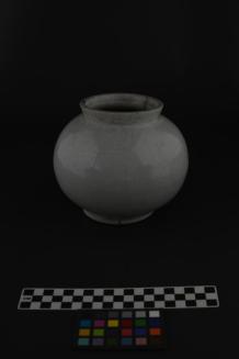 DescriptionGlazed, circular ceramic jar. Unleveled base, leans slightly to one side. Light blue with no design.Status