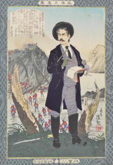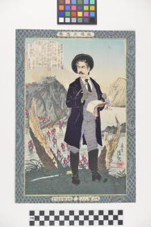 DescriptionPortrait of the journalist Fukichi Gen'ichiro reporting on the Satsuma Rebellion in 1877. He is shown with a notebook and brush in hand, wearing a Western style plaid suit, black jacket, and hat. Meiji troops ford the water behind him to engage the rebels atop a rocky cliff. A great image of a modern Japanese man.Status