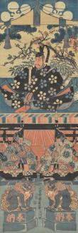 Descriptionone scroll with two woodblock prints. Upper image depicts a seated samurai?, with Japanese cherry blossoms in the background. The bottom image is of two seated samarui?Status