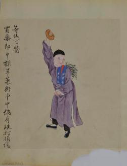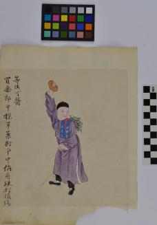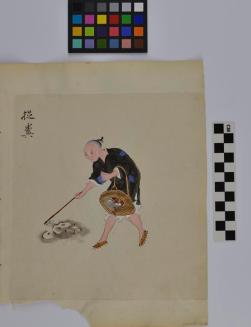 DescriptionSide A depicts a man gathering eggs. Side B depicts a man in a purple robe holding a disk above his head with his right hand.Status