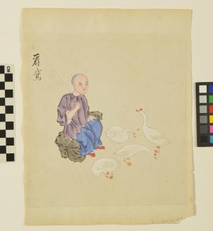 DescriptionSide A depicts a man holding a trident like tool. Side B depicts a man seated on a rock feeding geese?Status