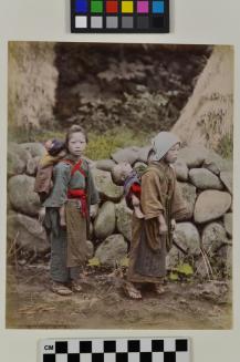 DescriptionTwo young girls are pictured carrying babies on their back.Status