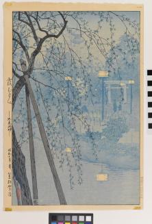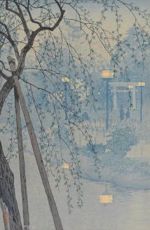 DescriptionView of Shinobazu Pond. Through the tree in the immediate foreground electric lanterns are visible lining the a waterfront path.Status
