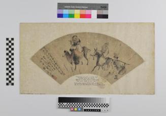 DescriptionMounted fan painting, depicting a man seated on a camel, another on a donkey, and a third man carrying a baskets of goods on a shoulder pole.Status