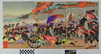 DescriptionScene from the Sino-Japanese War of Japanese troops attacking a Chinese fortress. Japanese forces rush forward from left and right to meet the Chinese troops pouring out of the entrance gate at right, clashing with sword, bayonets, and pole arms. Several wounded or dead enemies lie beside a dismantled cannon at bottom center, while at left a Japanese soldier engages two attackers at the same time. Japanese warships fire on the fortress, with shots exploding along the wall and orange flames billowing skywards.Status