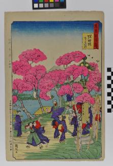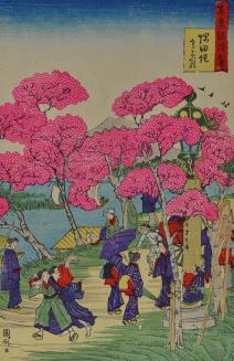 DescriptionWomen in kimono with umbrellas walk a path lined with Japanese cherry blossoms. Two men stumble by in the opposite direction.Status