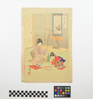 DescriptionTwo women liesurely engaging in flower arranging and reading togetherStatus