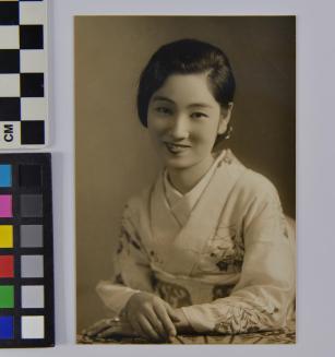 DescriptionPhoto of Geisha Ichimaru seated with her arms crossed and resting on a table. Her head is slightly cocked to the left and is smiling at the camera.Status