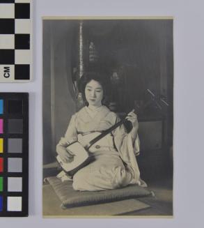 DescriptionPhoto of Geisha sitting on a pillow on the ground, playing a koto.Status