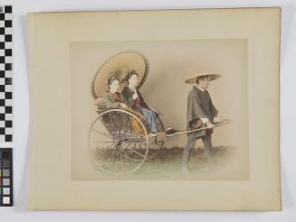 DescriptionThese two ladies are riding in a rickshaw being pulled by a man in a traditional hat.