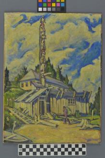 DescriptionFigure standing in front of a small wooden structure, with totem pole behind.Status
