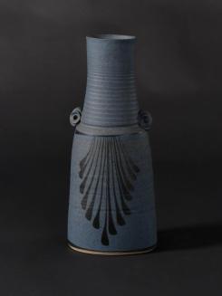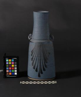 DescriptionTall blue porcelain vase. Blck pigment brushwork. High fired reduction.Status