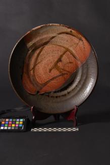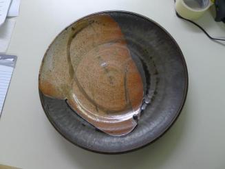DescriptionWood fired large plate with black glaze poured on edge. Iron brushwork decoration.Status