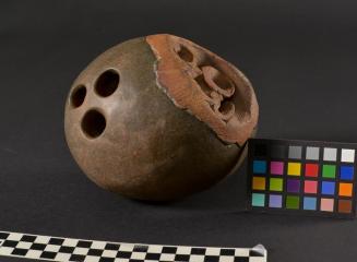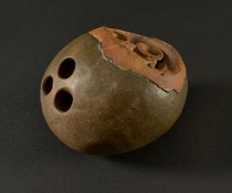 DescriptionRounded coconut shaped brown glazed earthenware sculpture with unglazed area. Circular indents on glazed un unglazed surface.