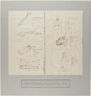 Descriptionsix sketches on individual pieces of unlined paper that have been glued to two larger pieces of lined paper. The sketches indicate dimensions and include written notesStatus