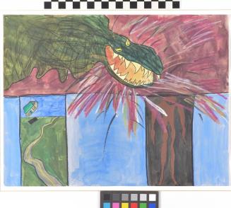 DescriptionSemi abstract painting depicting a green fanged lizard (?) at the top half. Lower is a landscape with small flying house and a figureStatus