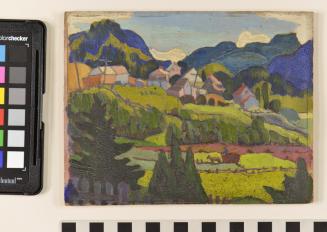 DescriptionBucolic landscape; a farmer and a horse working the field, small colourful village and rolling hills in the background.Status