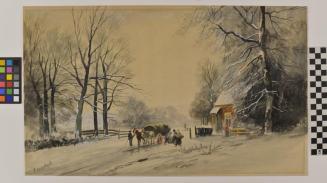DescriptionWinter scene with people loading a horse-drawn cart with goods along a snow covered road, villagers going about their businesses around.Status
