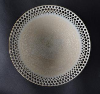 DescriptionSpeckled pink coloured porcelain charger with accents of blue around the four rows of circular perforations along the edge.Status