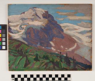 DescriptionSnowy mountain peak, green rolling hills and cloudy skies.Status