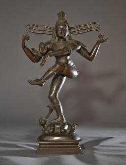 DescriptionStatuette depicts the Hindu god Shiva Nataraja standing on his right foot proper on top of a demon who rests on a cushion with a cobra. Figure has four arms: a cobra uncoils from his lower right forearm, his upper right hand holds a small drum shaped like an hourglass, his upper left hand holds a flame and his lower left hand points toward his raised left foot. The head of figure has a headdress and a section of 3 wavy parallel bars (representing hair) attached at the back of the head. Statuette rests on a raised tiered base or dais with incised decorative motifs.Status