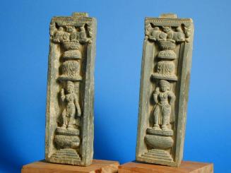 DescriptionGrey schist carved pillar; female figure on pedestal below three animals on second pedestal.Status