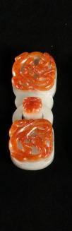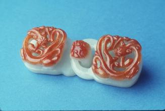 DescriptionEach end of the buckle is decorated with a flatened sinuous zhi dragon in openwork, the hook is shaped like a dragons head. There are flattened round studs on the back side.Status