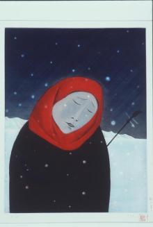 DescriptionWoman in a red headscarf and a black robe stands with her head bent and her eyes closed in a dark snowy landscape.Status