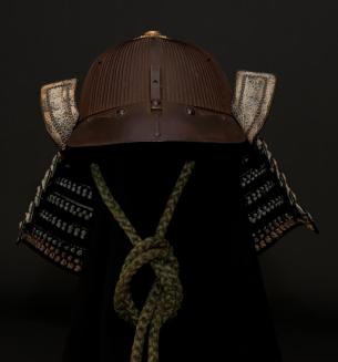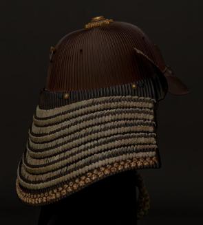 Description120 plate helmet has metal ridges that radiate from a central circular vent hole at the top that is decorated with brass fittings. A ridged metal band around the lower edge, attached with decorative brass rivets(?), is turned upright at the two ends (at sides) and is decorated with blue patterned leather and braided cord. Five rows of toothed lacquered neck guard plates, lashed together with silk cords are attached to the lower edge and hang down around the back and sides. There is a metal peak at the front with a fitting for a helmut decoration. The interior has a blue cotton liner with a leather band and a heavy braided blue silk cord that ties around the chin.Status