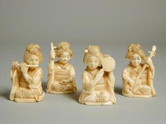 DescriptionWoman musician with transverse flute. Dark colour tone her hair & designs in robe.Status