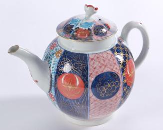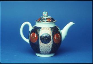 DescriptionA globular body with loop handle decorated with typical Japan pattern. Eight panels in alternating underglaze blue and white grounds painted with overglaze red, turquoise and grey enamels with gilding throughout. Cover has a repetition of pattern and a flower knop.Status