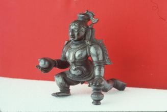 DescriptionThis statue represents the crawling infant Krishna stealing a ball of butter in his right hand and using his left hand for support. The child god according to tradition was inordinately fond of butter, and would steal it as often as he could. Most representations of this type were small and intended for domestic shrines. He is always depicted naked, but richly adorned with jewellry. The sculptor has obviously made a keen observation of life in the naturalistically modelling he has shown. The full legs and buttocks are well articulated.