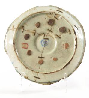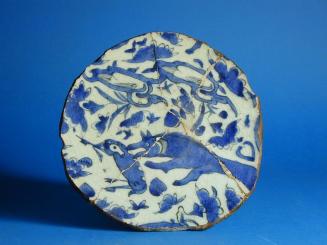 DescriptionEight large spur marks on bottom. Blue band underglazed around outer rim. Transparent celedon glaze. Interior - wolf attacking helpless animals. Two swans, floral motif. Four fragments, repaired with 12 rivets or staples. Should be photographed, front & back.Status