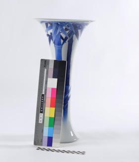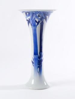DescriptionBlue & white trumpet shaped vase has bamboo decorationStatus