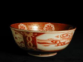 DescriptionCentral decoration of two scholars in a garden surrounded by painted textile & floral designs. Decorations of heavy gilding on bright red enamel.Status