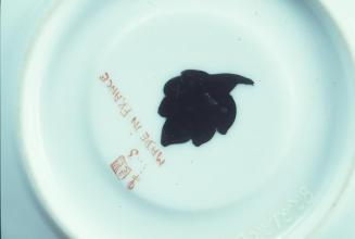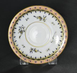 DescriptionDecorative border in peach, dark blue & gold around the rim. A scalloped pattern resembling a flounce with loops trimmed with bows suspended from the blue border. Blue floral sprigs trimmed with gold are scattered on the white gound. Two small vignettes, one showing Oriental garden with pavillion, the other two flamingo like birds in watery landscape.Status