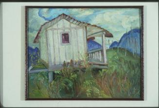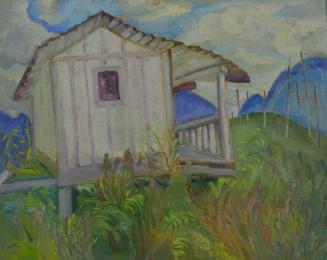 DescriptionA small cabin with a deck made of light-coloured wood logs in a grassy field. In the distance are blue mountains.Status