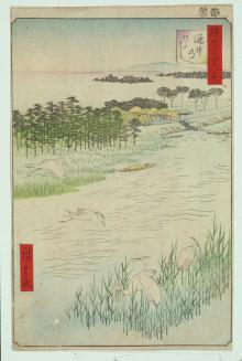DescriptionAt bottom right 3 cranes rest in bamboo at waters edge while 2 more fly down. On the far shore are banks of bamboo, a barge with a yellow thatched roof, & a village with a boat landing. A ferry is arriving at the village, another is departing.Status