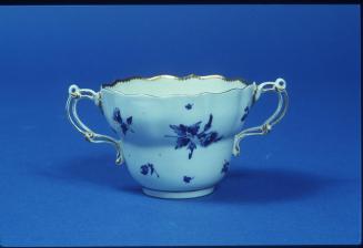 Descriptionblue, gold on white; waisted cup with gently fluted rim and silver form handlesStatus