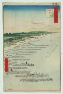 DescriptionCoastal scene with figures in boats among the marsh grasses at the shore, sail boats further up the coast. Buildings edge the water, beyond is green vegetation. A series of mountain peaks in the distance.Status