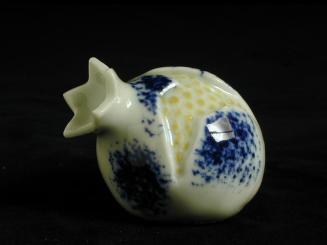 Descriptionpomegranate shape; white with blue design; seeds- yellow glaze; very small openingStatus