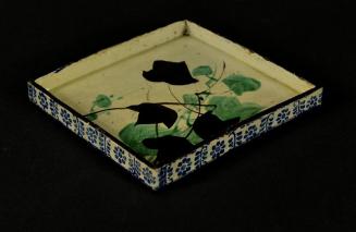 Descriptionsquare; overglaze green & brown-black enamels (ivy design) on white; blue on white floral motifs outer surface/edges