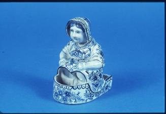 DescriptionWoman sitting on a chamber pot, finger holes allow audience to supply her legs.Colour: blue;white