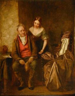 DescriptionA man sits holding a money bag between his knees & behind him a woman rests one hand on his shoulder & her other hand is stretched out, palm up.Status